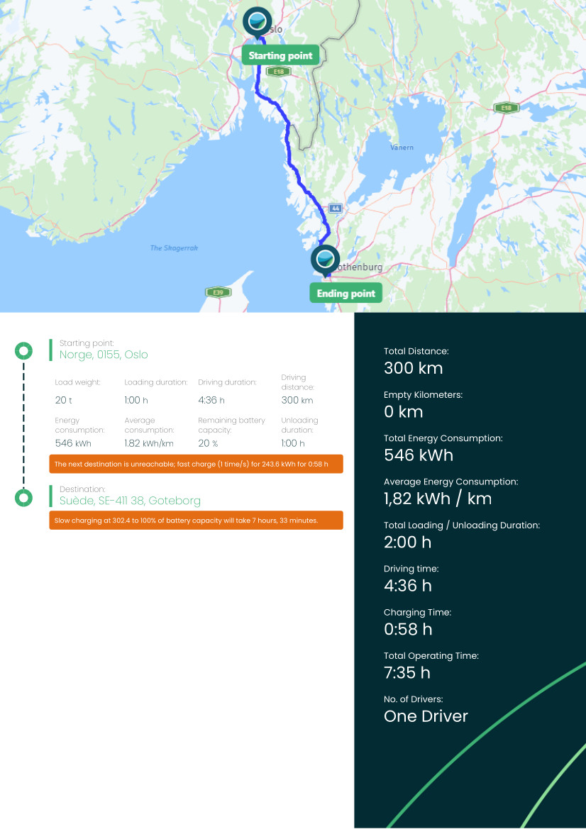 Upon completion of these steps, the BEVI will process the inputs and generate a comprehensive report detailing total route distance, estimated energy consumption, required charging times, and locations. This personalized report provides a clear snapshot of what switching to BEVs for your transport needs would look like, making your supply chain more sustainable and efficient.